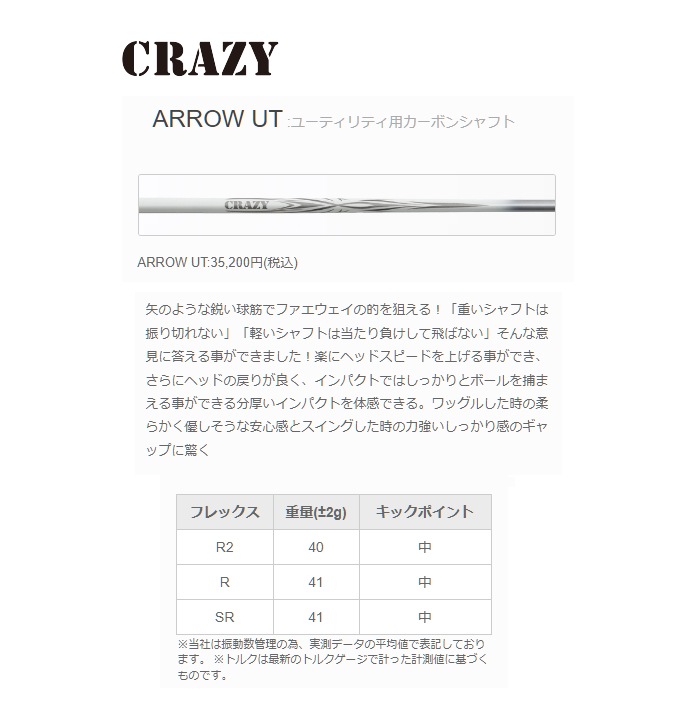 トップ > ブランドで選ぶ > クレイジー > 【当店は安心の正規販売店です】クレイジー(ユーティリティ用シャフト)CRAZY ARROW UT・ クレイジーアローUT ・スリーブ付シャフト対応【リシャフト工賃込】