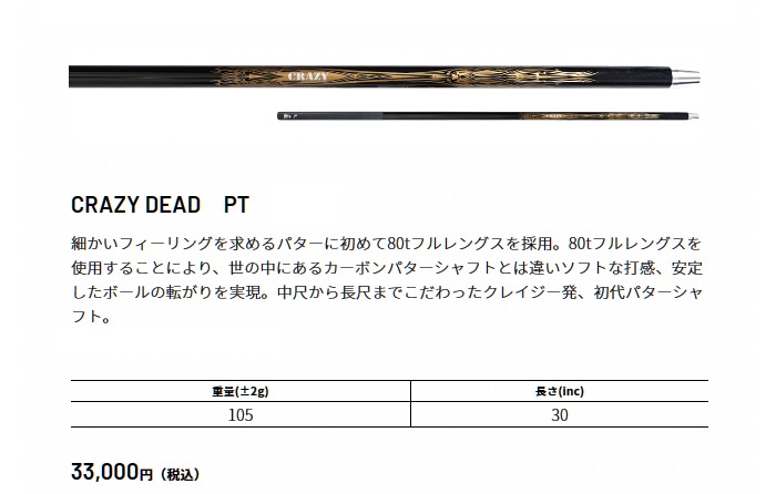 トップ > ブランドで選ぶ > クレイジー > 【当店は安心の正規販売店です】クレイジー(パター用シャフト)CRAZY DEAD PT パター【リシャフト工賃込】
